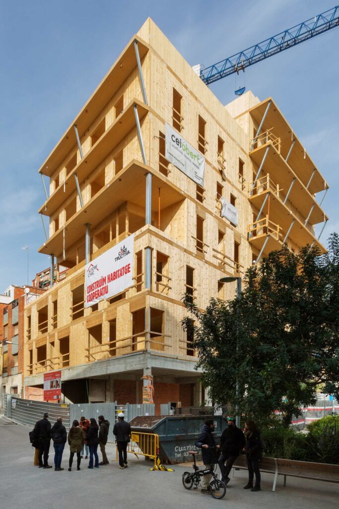 Un exemple pioner és l’edifici Cirerers, al districte de Nou Barris de Barcelona, promogut per la cooperativa Sostre Cívic i dissenyat per Celobert. Amb vuit plantes i 32 habitatges de fusta contralaminada d’avet i materials de baixa petjada ecològica, s’ha convertit en l’edifici de fusta més alt de l’Estat espanyol. Gràcies a l’assegurança decennal concedida per ASEFA —intermediat per Arç Cooperativa—, el projecte demostra que la innovació tècnica, la sostenibilitat ambiental i la garantia estructural poden avançar juntes dins del marc normatiu.